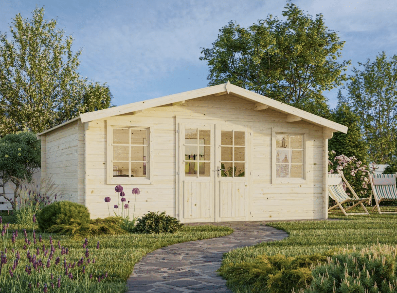 Chalet en bois massif robuste et lumineux, idéal comme espace de rangement, atelier ou bureau de jardin.