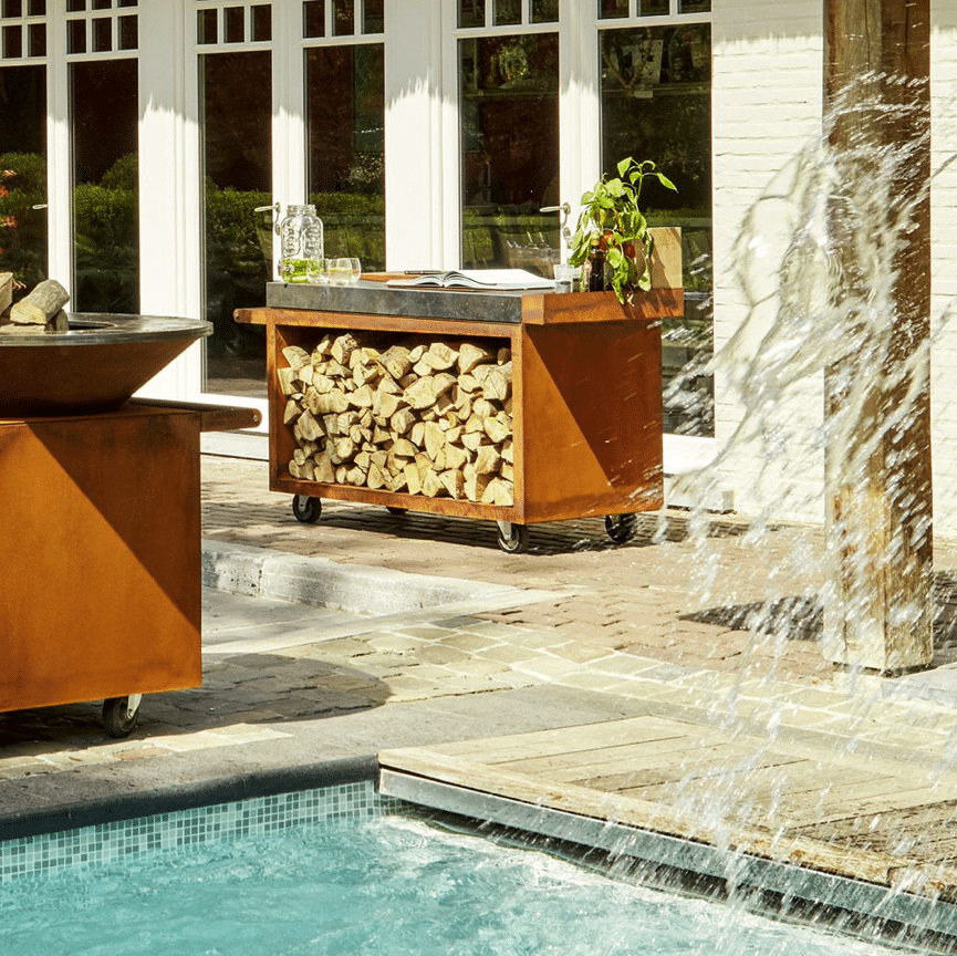 Les tables Mise en Place 135 PRO d’OFYR sont des meubles de cuisine d’extérieur spacieux, disponibles en acier Corten ou noir. Elles offrent des surfaces de travail en bois de teck ou en céramique gris anthracite, combinant esthétique et fonctionnalité pour une préparation culinaire extérieure optimale.